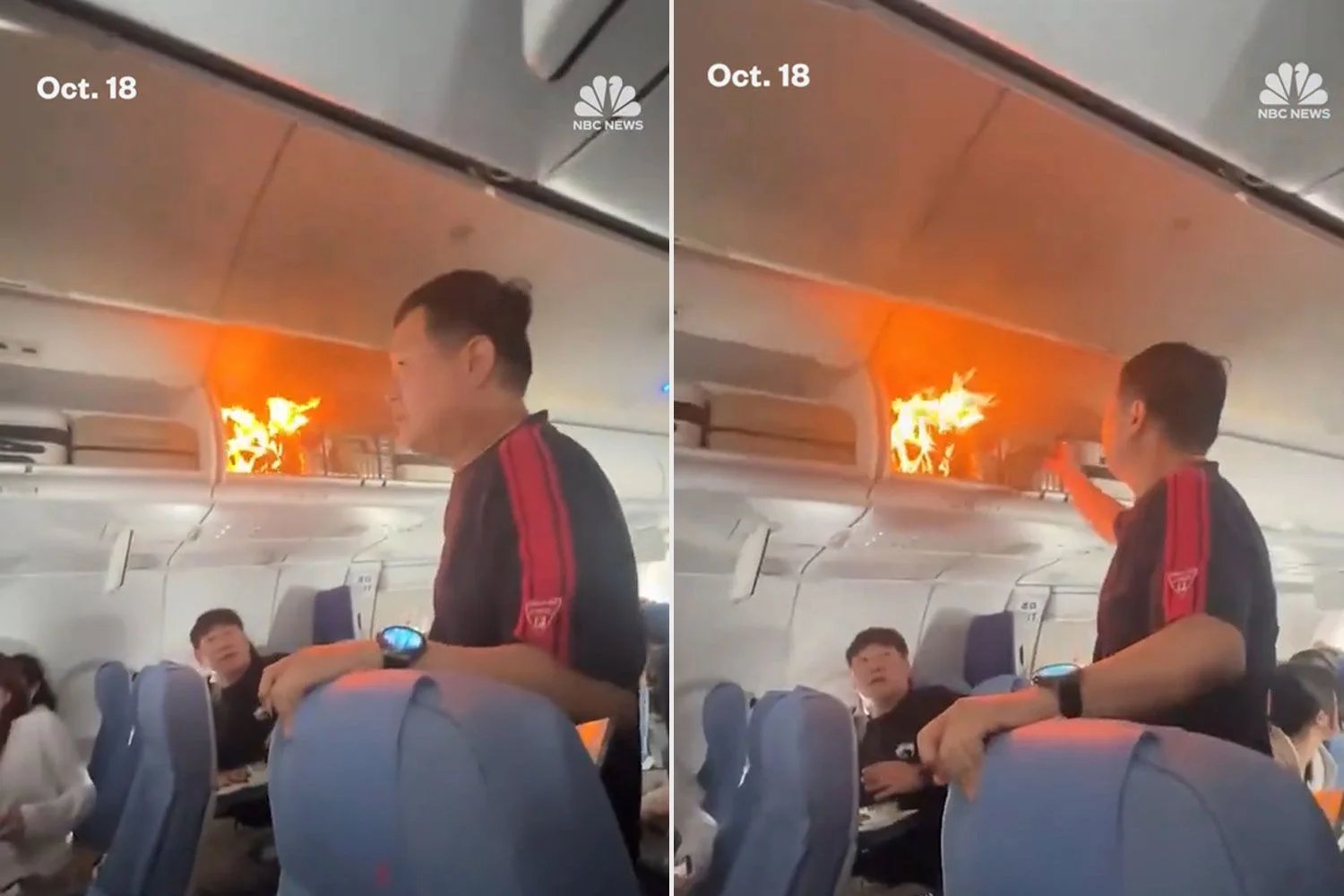 Footage of the incident filmed by passengers and obtained by NBC News shows smoke and flames emanating from an open overhead bin as visibly concerned passengers flag the cabin crew for help. Two members of the airline crew can then be seen hurrying from the rear of the plane toward the fire.