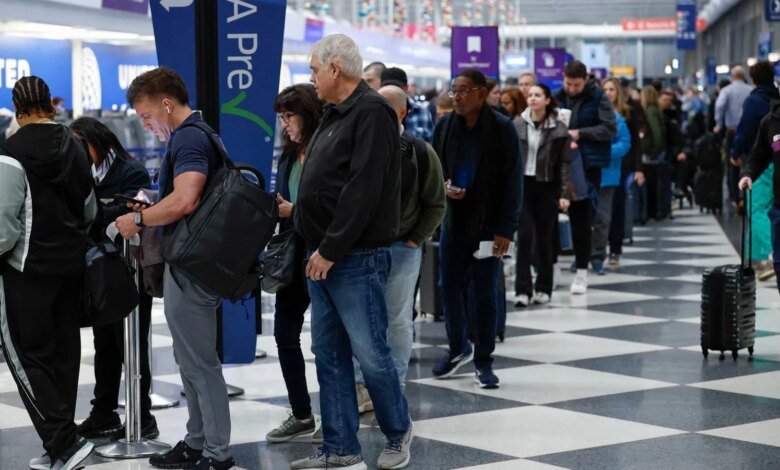 Travelers wait in line at a security checkpoint at O’Hare International Airport in Chicago, Illinois on November 7 2025.