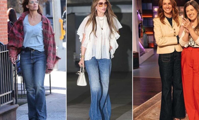 Tons of A-listers have been spotted wearing the retro-inspired denim style in recent months. Katie Holmes wore a pair of casual, mid-wash flare jeans while on the set of her new movieHappy Hoursin New York City. Meanwhile, Julia Roberts appeared on theKelly Clarkson Showin dark wash flares with patch pockets, and Jennifer Lopez gave the trend a boho twist in a distressed pair. I’m convinced that the once-polarizing denim style has earned a modern refresh.